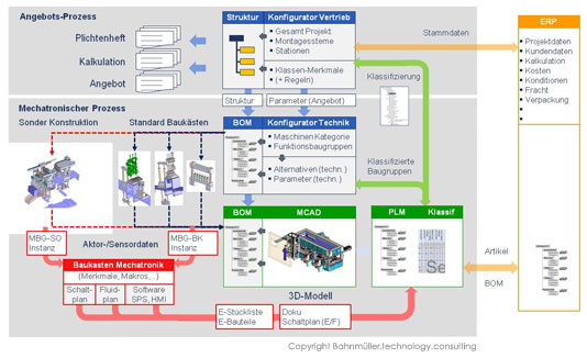 Wichtige Ziele dabei sind: Höchstmögliche Konsistenz aller Daten von Angebot bis zum ausgeliefertem Auftrag. Im Angebotsprozess sollten alle technischen Standards aktuell und transparent sein. Bei der Konfiguration braucht nicht alles automatisiert zu erfolgen, sollte aber eindeutig und klar sein (Sondermaschinen). Ein durchgängiges Datenkonzept mit zentraler Datenhaltung und disziplinspezifischen Daten sichert konsistente Daten und minimiert den Pflegeaufwand.
